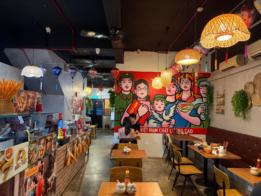 The space occupies a former gelato parlour, and while much of the industrial‐brick and concrete aesthetic remains, there are thoughtful Vietnamese touches sprinkled throughout – lanterns, a mural reminiscent of Saigon street art, and a softly lit, casual vibe. It’s a modest size, more intimate than large-scale, making it suited for a relaxed lunch or dinner with friends. The location is roughly a 15-minute walk from Bedok MRT.