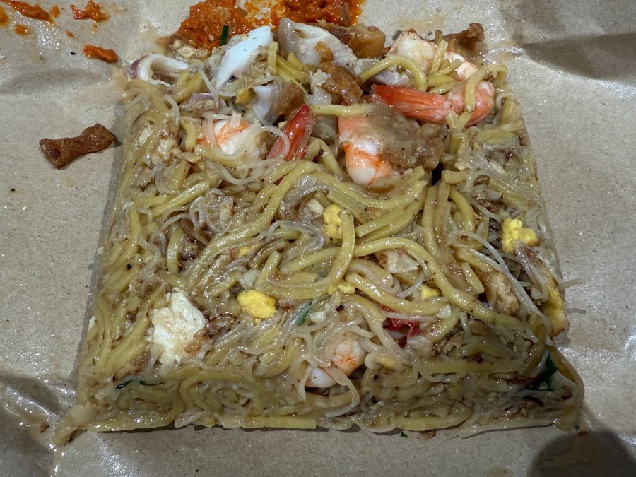 It took me around 20 minutes to get home and this was a $9 order. This looks like the slightly drier type of fried hokkien prawn mee. They were generous with the amount of sotong pieces and de-shelled prawns and there was a heaping scoop of sambal belacan.